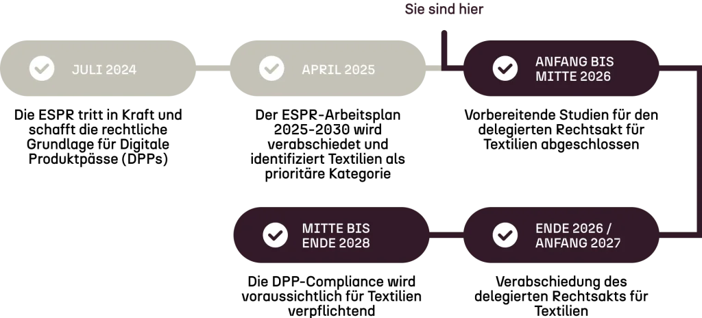 • Mitte bis Ende 2028 – Die DPP-Pflicht für Textilien tritt voraussichtlich in Kraft, nach einer Übergangsfrist von mindestens 18 Monaten