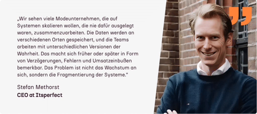 Wie Stefan Methorst, CEO von Itsperfect, feststellt, stoßen viele Marken auf Probleme, wenn sich die Systeme nicht mit ihnen weiterentwickeln: „Die Daten werden an verschiedenen Orten gespeichert, und die Teams arbeiten mit unterschiedlichen Versionen der Wahrheit. Das macht sich früher oder später in Form von Verzögerungen, Fehlern und Umsatzeinbußen bemerkbar.“